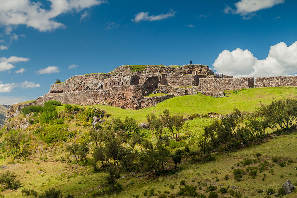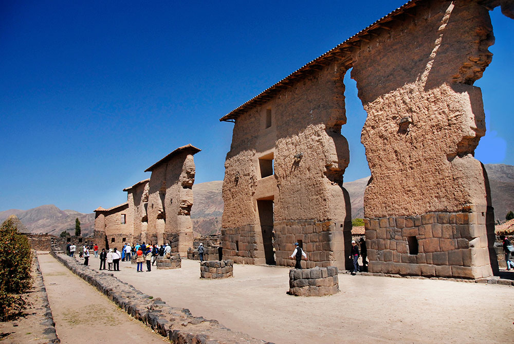 Raqchi (God Wiracocha Temple): Located 121 kilometers from Cusco, this Inca temple is monumental: 100 meters in length, 26 meters in width and 14 meters in height. Divided in two naves, each of these still retain the base of eleven giant columns. The base of the walls consists of Imperial Inca stonework with a top section of adobe. Adjacent to the temple, we can see many storehouses, used for various purposes: military and religious.