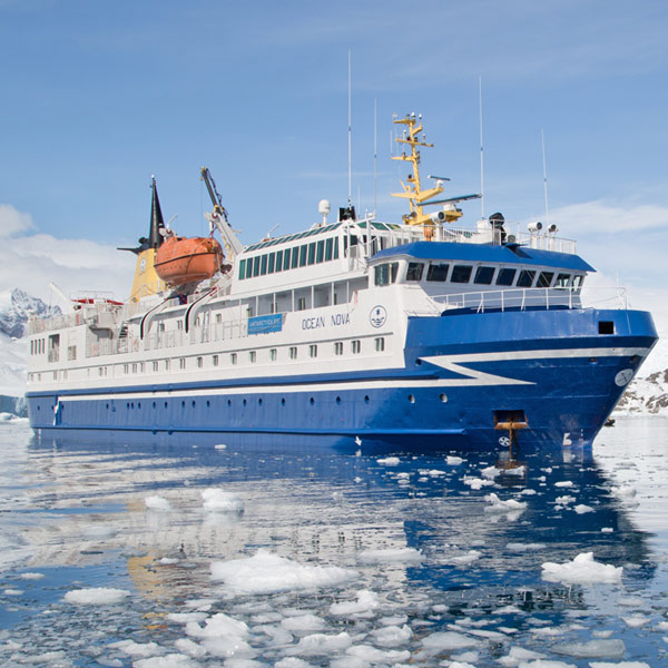 The Ocean Nova is a small, ice-strengthened expedition ship designed for intimate Antarctic adventures. It offers cozy cabins, panoramic lounges, and Zodiac boats for close-up wildlife and landing experiences.