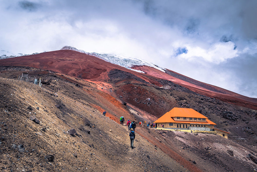 Enjoy a scenic lunch at Tambopaxi, a working farm and lodge with spectacular volcano views, before ascending Cotopaxi’s slopes. A zigzagging drive or horseback riding brings you to a striking red lava landscape where a short hike leads to the mountaineers’ refuge at 4,630 m (15,200 ft). Here, warm up with a hot beverage and soak in the dramatic vistas of the Andean highlands stretching far below.