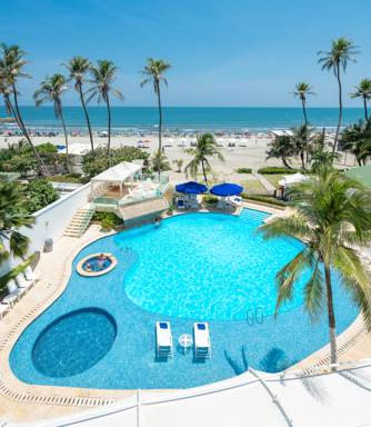 Cartagena, Colombia: Dann Cartagena Hotel . Located in the peaceful El Laguito area of Bocagrande, this four-star high-rise offers direct access to the beach, a rare feature in the neighborhood. Guests can enjoy modern, spacious rooms, many with balconies and stunning views of the Caribbean Sea. Each room includes a flat screen TV, minibar, complimentary WiFi, and daily breakfast. A standout feature of the property is its beachfront pool with mosaic tiles, a jacuzzi, and a sun deck with loungers that lead straight onto the sand. Dining is available at Bucaneros, the on-site restaurant, which serves a variety of local and international dishes, including fresh seafood and a generous buffet breakfast. With its quiet beachfront location and close proximity to Cartagena’s historic walled city, just a short drive away, Hotel Dann Cartagena provides an ideal balance of relaxation and easy access to cultural attractions for all types of travelers.