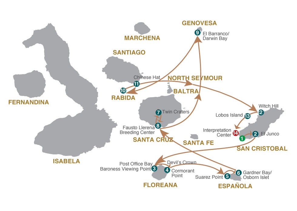 In summary, your Galapagos Cruise will take you on a journey visiting (*):