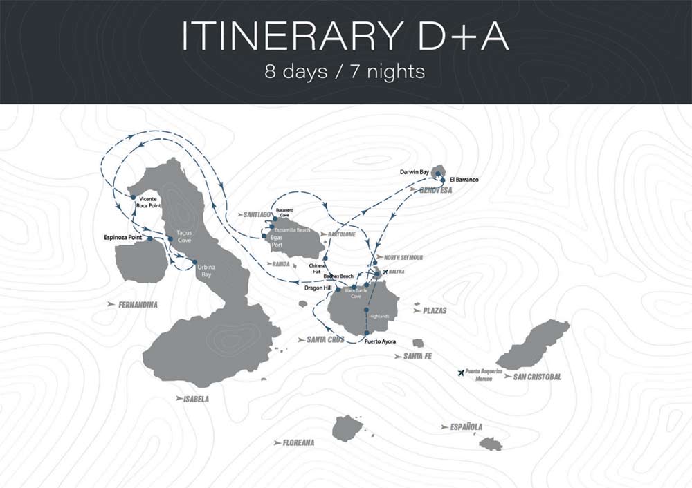 This 8-day journey aboard the Hermes Galapagos Mega Catamaran follows Itinerary D + A from Thursday to Thursday, offering a comprehensive exploration of the Galapagos Islands through a carefully curated combination of iconic visitor sites and remote locations.