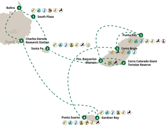 Important Note: Although unlikely, itineraries in Galapagos Islands are subject to change due to weather, wildlife, safety, park regulations, guest abilities, or operational needs. Images shown are referential, and not all listed activities on each visitor point may be completed. Your guide and captain will always aim to choose the best possible itinerary.