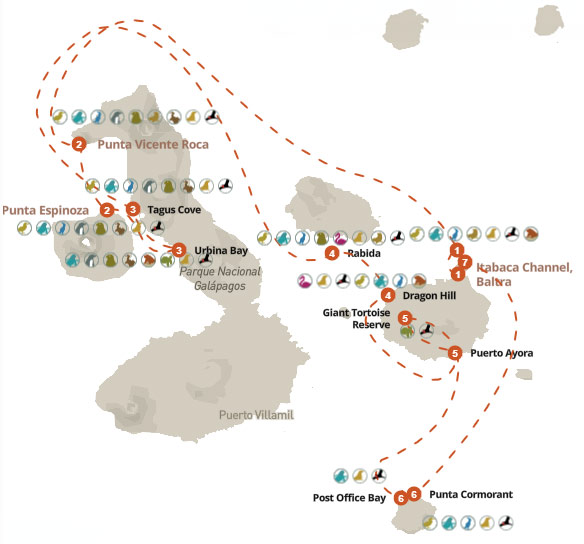 Important Note: Although unlikely, itineraries in Galapagos Islands are subject to change due to weather, wildlife, safety, park regulations, guest abilities, or operational needs. Images shown are referential, and not all listed activities on each visitor point may be completed. Your guide and captain will always aim to choose the best possible itinerary.