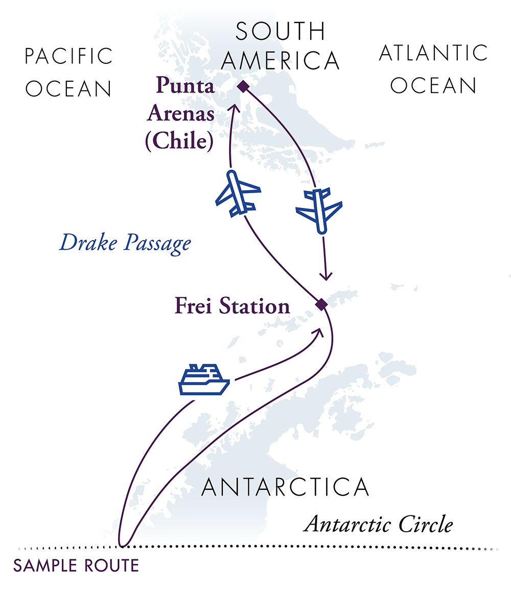 Scheduled Flight to Antarctica. A two-hour exclusive charter flight takes you from Punta Arenas to King George Island in the South Shetland Islands. As you step off the aircraft, the crisp Antarctic air fills your lungs for the first time. You’ll then board a transfer vehicle, passing Chile’s Frei Station and Russia’s Bellingshausen Station, before reaching the shore to board a Zodiac that will take you to your boutique expedition vessel.