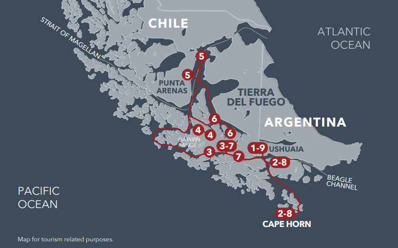 Boarding resumes at 18:00, followed by a welcome toast and an introduction to the Captain and crew. The ship will then set sail toward the southernmost points of the region, navigating the legendary Strait of Magellan and the Beagle Channel as we continue to explore the fjords and channels of Patagonia and Tierra del Fuego.