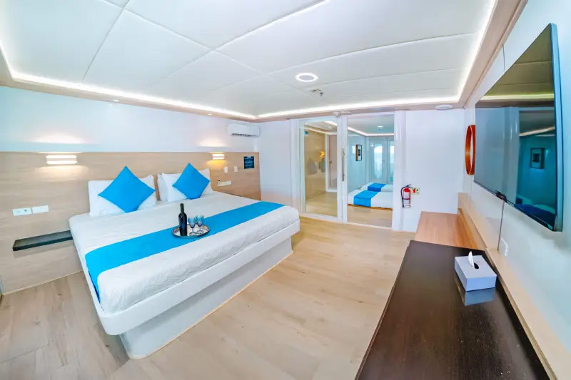 Each of the large suites, measuring 215 square feet, features private facilities and a personal balcony, offering a front-row seat to the islands’ ever-changing scenery. Whether you’re enjoying the ocean breeze from your terrace or relaxing in one of the elegant social areas, you’ll feel completely at ease in your floating sanctuary.