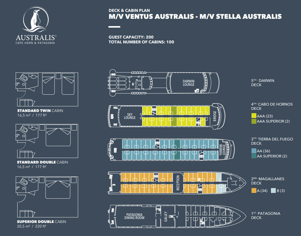 The M/V Ventus Australis is a modern expedition vessel specially designed to navigate the remote fjords and channels of Patagonia and Tierra del Fuego. Built in 2017, it features a reinforced hull for safe sailing through the icy waters of the southernmost regions of South America. Read More